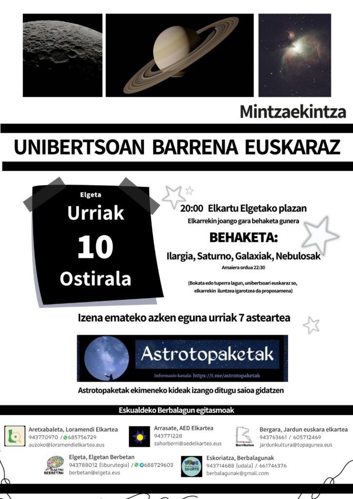 Aurten, gainera, hainbat ekintza osagarri eskainiko dira: kultur irteerak, bisita gidatuak, astrotopaketak,…; guztiak euskararen erabilera sustatzeko eta parte-hartzaileak komunitate aktibo batean txertatzeko. Hain zuzen, urriaren 10en astrotopaketak egingo ditugu “Unibertsoan barrena euskaraz” lelopean, izarren azpian euskaraz bizitzeko eta elkarrekin gozatzeko aukera paregabea eskainiz.