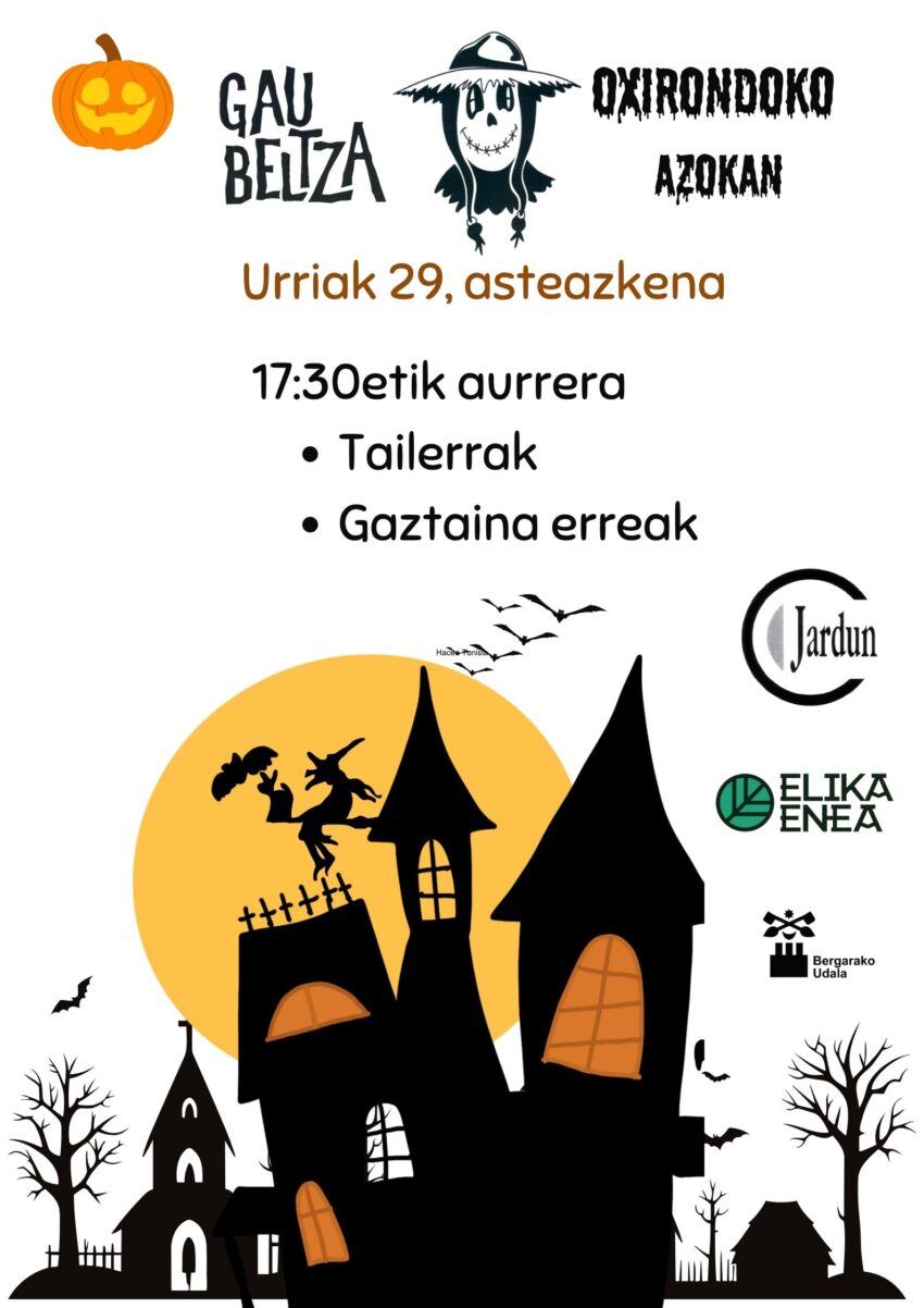 Asteazkenean, arratsaldeko 17:30etik aurrera Oxirondo azokan “Gau beltza”-ren inguruko tailerrak antolatu ditugu. Bertan besteak beste, kalabazak hustu, jantziak… egingo ditugu. Zatoz eta ekarri kalabazak eta izara zaharrak!!