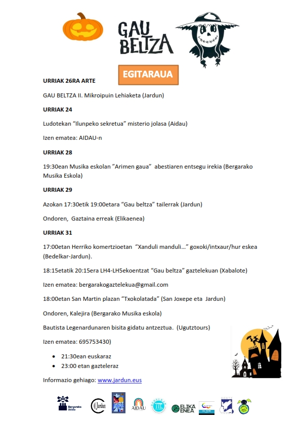 GAUUUUU BELTZAAAAAA!!!! Posted on 2025/10/272025/10/24 by jardun Bergarako eragile ezberdinok Udalaren laguntzarekin “Gau beltza”-ren inguruan egitarau zabala antolatu dugu herriko txoko ezberdinetan. Elkarbanatu:TwitterFacebookEmail