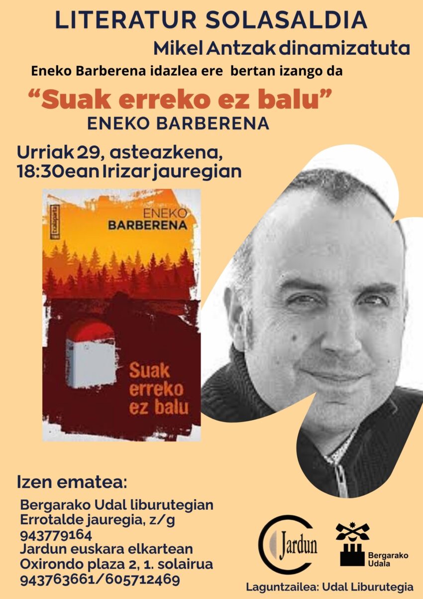 Urriaren 29an (atzeratu ostean) egingo dugu 2. udazkeneko literatur solasaldia. Mikel Antza dinamizatuko du baina oraingo honetan egilea ere, hau da, Eneko Barberena, gurekin egongo da.