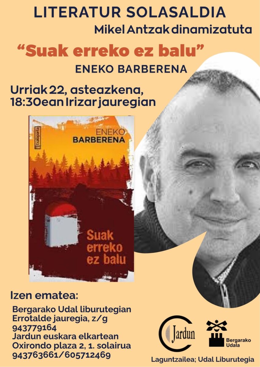 Urriaren 22an egingo dugu 2. udazkeneko literatur solasaldia. Mikel Antza dinamizatuko du baina oraingo honetan egilea ere, hau da, Eneko Barberena, gurekin egongo da.