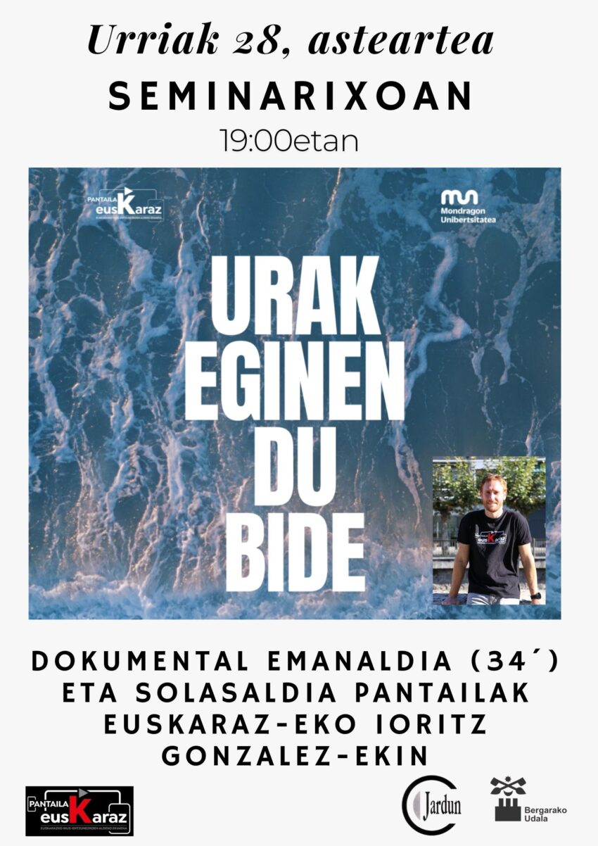 June Agirre Ansa, Alex Altuna Tojal eta Oier Markotegi Zubillaga Mondragon Unibertsitateko ikasleek egin dute “Urak eginen du bide” dokumentala. Hauxe izanik dokumentalaren argumentua: «Azken hamarkadetan iraultza digitalak hainbat aldaketa ekarri ditu pantailen eta ikus-entzunezkoen kontsumoan. Testuinguru berri horretan, euskarak bizi duen egoeraren berri jasotzen du lanak zenbait adituren bitartez». Pantailak euskaratzeko erronkari begira, aintzat hartzeko hausnarketa ugari entzuten dira 30 minutuko lanean.